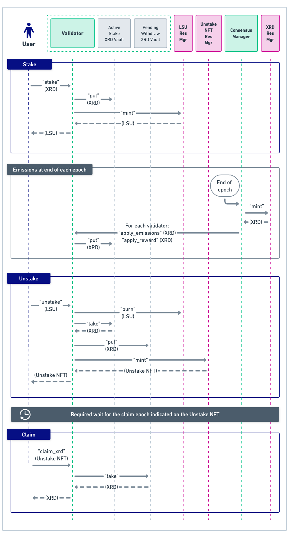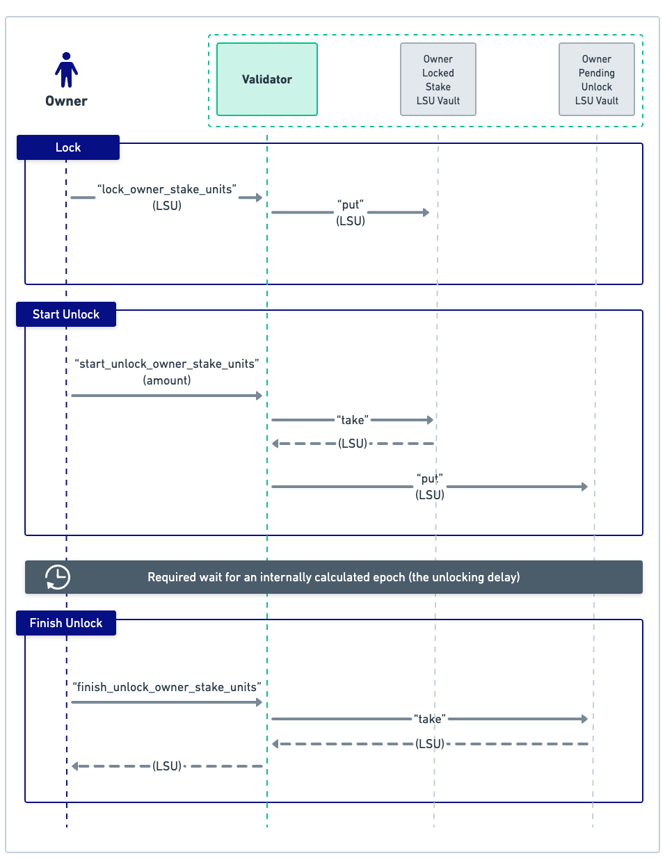 Note: This diagram purposefully does not show any staking/unstaking. These are separate processes: the Owner still needs to stake to his Validator (the usual way) if he wants to obtain Stake Units to lock - and similarly, after finishing the lengthy unlocking, the Owner still needs to go through the regular unstaking process in order to obtain XRD.